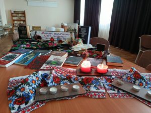 Здобувачі віщої освіти жваво приймали участь в обговорюванні даної теми, після чого їм була представлена до перегляду книжкова виставка «Україна Пам’ятає – Світ Визнає» з фондів бібліотеки ОНМедУ. Книжкова експозиція охоплює видання, що висвітлюють різні аспекти Голодомору: від історичних досліджень до свідчень тих, хто пережив цю трагедію, а також літературні твори, які влучно передають глибину людської скорботи та опору. Ці книги не лише допомагають відновити історичну правду, але й дають змогу краще зрозуміти, як пережили ці події наші предки, як вплинуло це на суспільство, культуру і родини. На книжковій експозиції додатково були розміщені елементи, що стали символами тих страшних подій: 5 колосків – нагадування про сумнозвісний закон «про п’ять колосків», який став передвісником Голодомору; квітка незабудка – символ пам’яті про жертв Голодоморів; страшна знахідка з однієї з книг нашої бібліотеки – хлібна картка; і, звісно, розсипане зерно і чорний хліб – саме ті речі, позбавлення яких запустило механізм масового вбивства українських селян штучно спланованим голодом.
