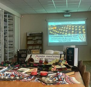 Сумна «Мелодія» Миколи Скорика супроводжувала перегляд цифрової фотовиставки «СТОРІНКАМИ ЧОРНИХ КНИГ…», що зібрала в собі світлини-підтвердження страшних нелюдських звірств радянського режиму по відношенню до мирних українців.