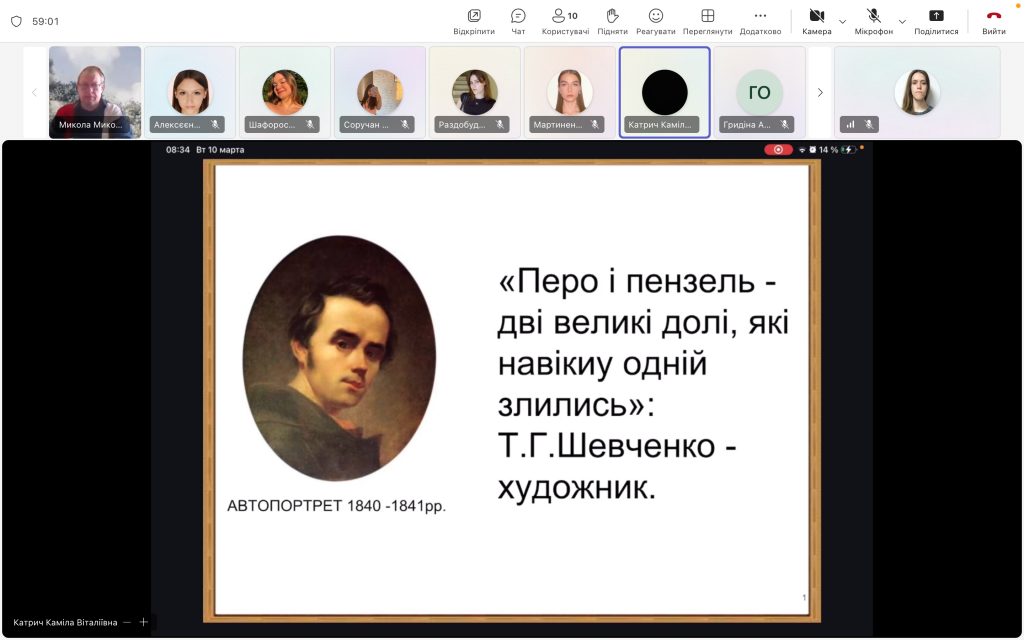 10 березня 2026 року на практичних заняттях з вибіркових освітніх компонент «Історія української культури» та «Теорія і практика мовної комунікації» серед здобувачів освіти груп ВК-204 та ВК-205 стоматологічного факультету відбулися виховні заходи, присвячені вшануванню пам’яті великого українського поета і митця Тарас Григорович Шевченка.