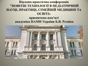 Запрошуємо Вас взяти участь у науково-практичній конференції з міжнародною участю «Новітні технології в педіатричній науці, практиці, сімейній медицині та освіті», присвяченій пам’яті академіка НАМН України Б.Я. Резніка, яка відбудеться з 17.04.2026 р. по 18.04.2026 р. у форматі дистанційної та особистої участі.