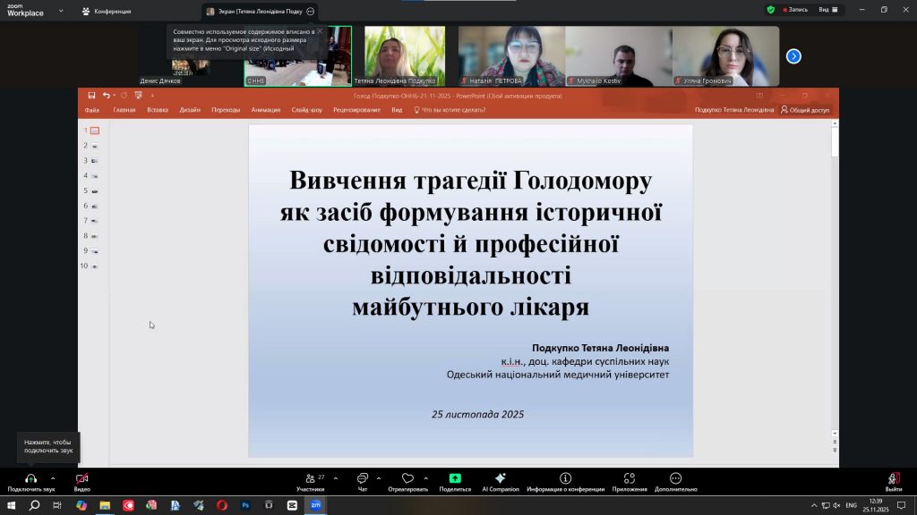 Під час практичного заняття ВК «Історія вітчизняної медицини» до заходу долучилися здобувачі 2 курсу Е 206 групи стоматологічного факультету. З доповіддю «Вивчення трагедії Голодомору як засіб формування історичної свідомості й професійної відповідальності майбутнього лікаря» вступила Тетяна Подкупко, кандидат історичних наук, доцент кафедри суспільних наук Одеського національного медичного університету. У своєму виступі дослідниця наголосила, що глибоке осмислення національних трагедій формує моральні орієнтири й гуманістичні цінності майбутніх медиків, сприяє розвитку емпатії та професійної етики, які є основою для відповідальної лікарської практики.